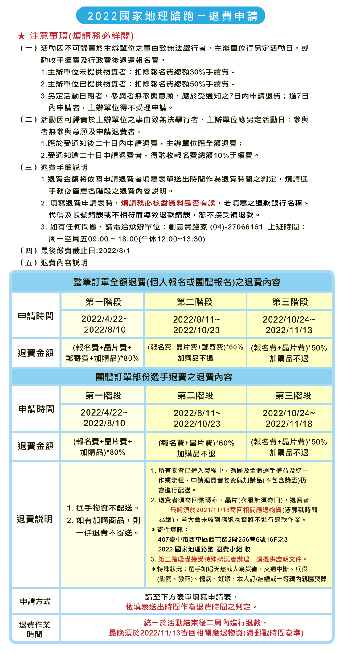 申請退費-注意事項 1. 大會將依據您所提供之帳戶進行退費,帳號填寫錯誤,事後恕不補退。 2.個人報名退款帳戶:僅能使用本人帳戶退款(非本人帳戶則不受理) 3.團體報名退款帳戶:須為團體聯絡人或退費選手其中一員(非兩者帳戶則不受理) 4. 團體報名(一筆訂單編號),僅限一筆帳號退款。請勿多筆帳號申請退款。
